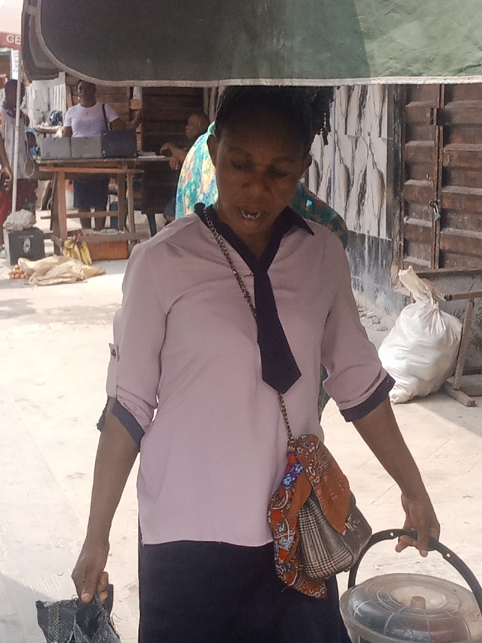 An adult female is centrally positioned in an outdoor street scene within Umuode, Nigeria, beneath a partial green awning
