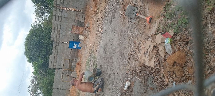 A shirtless man carries two buckets on a dirt lot with a cinder block wall in the background. A blue barrel and other items are stacked against the wall. Debris litters the ground, including leaves, cardboard, and an orange-handled shovel. The scene is viewed through a blurred foreground, possibly a fence.