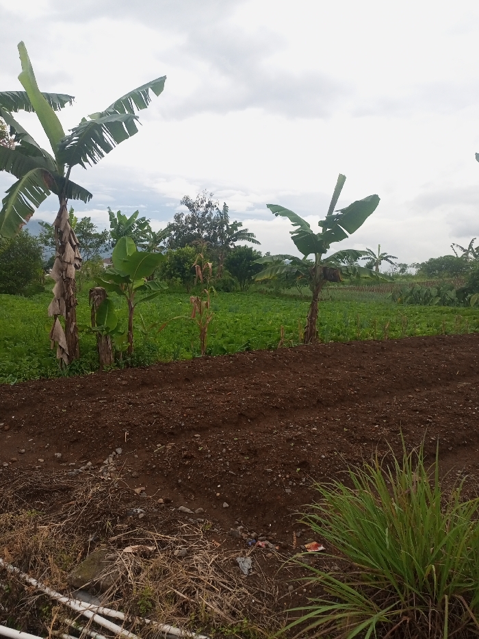 A rural landscape showcases a freshly tilled brown field in the foreground. Banana trees stand scattered throughout the midground, bordering a lush green field dotted with various crops. Beyond this lies a cluster of trees, fading into a cloudy sky. Vegetation thrives in the lower right corner, partially obscuring white pipes. The scene suggests agricultural activity in a tropical or subtropical setting.