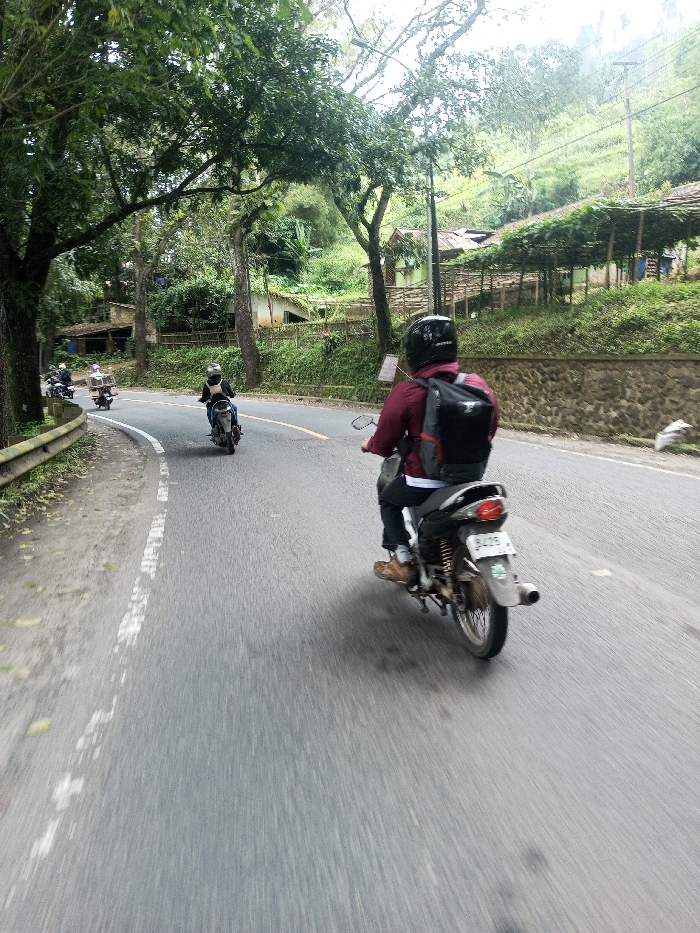 An image captured from a moving perspective depicts a multi-lane asphalt road curving to the left, likely within the city of Khajuripada, India. In the immediate foreground, a person wearing a dark helmet, a maroon long-sleeved shirt, dark trousers, and brown shoes rides a dark-colored motorcycle. A black backpack with gray accents is worn. The motorcycle's rear license plate partially displays "8475." Further along the curved road, two additional motorcyclists are visible, also proceeding in the same direction. The first wears a helmet and dark attire, while the second, further back, transports a large, light-colored package or box on their motorcycle. To the left of the road, a dirt shoulder with a white dashed line transitions to a metal guardrail. Beyond this, large trees with dense green foliage line the road. To the right, a low stone wall runs parallel to the road, topped with green vegetation. Behind this wall, the terrain ascends into a lush, green hillside. Scattered along the hillside are several simple structures, including houses with light-colored exteriors and dark roofs, and a prominent covered structure with a lattice-like roof, possibly for cultivation. Utility poles with overhead wires are also present on the hillside. The background features heavily vegetated hills under an overcast sky, indicating daylight conditions.