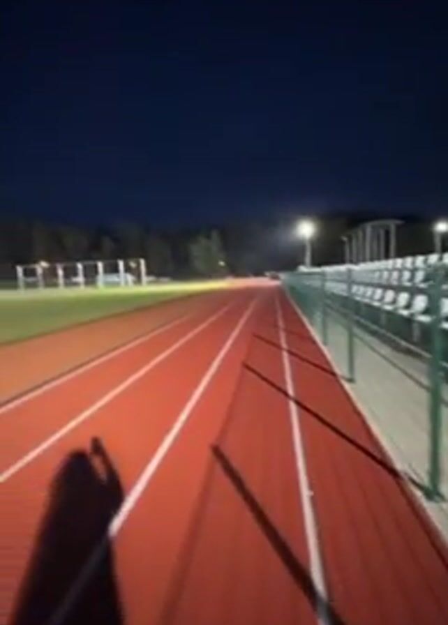A person walks along a red track at night