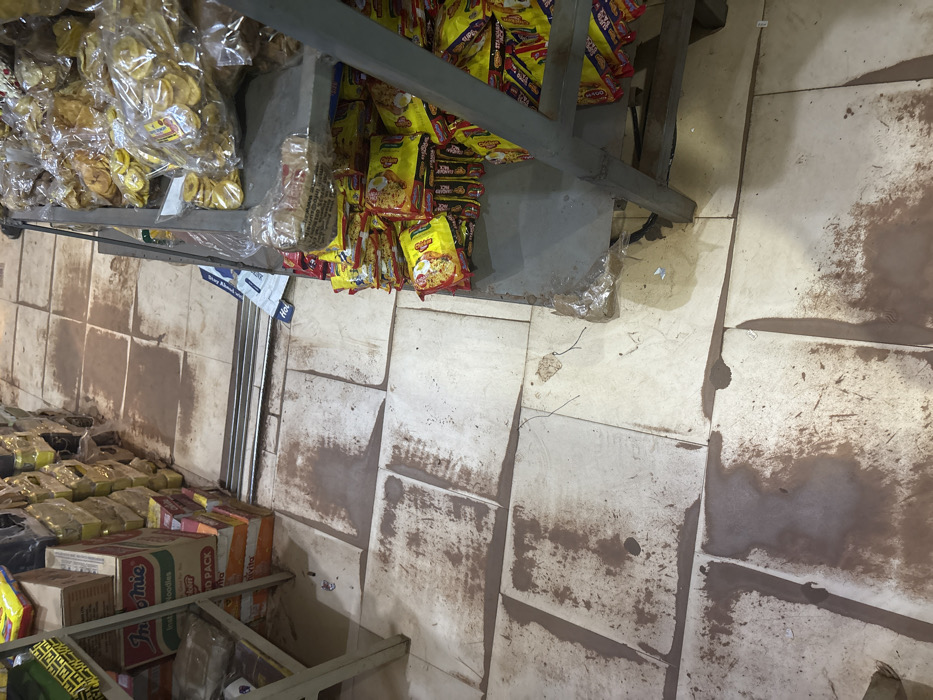 A shelf displaying snacks, including packaged chips, plantain chips, and Indomie noodles, sits against a tiled floor. The tiles exhibit significant staining along the grout lines and on their surfaces. The image's perspective is slightly angled, showing the shelf and floor from a high vantage point. A metal frame supporting the shelf is visible.