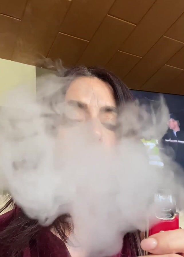 Here's a detailed description of the video: A woman with brown hair and wearing a maroon robe is vaping. She exhales a large cloud of vapor directly towards the camera, obscuring her face for a moment. After the vapor clears, she brings the red vape device to her lips and inhales. In the background, a television screen displays a scene with people in safety vests. The room has a wooden ceiling. The camera angle is from below, looking up at the woman.