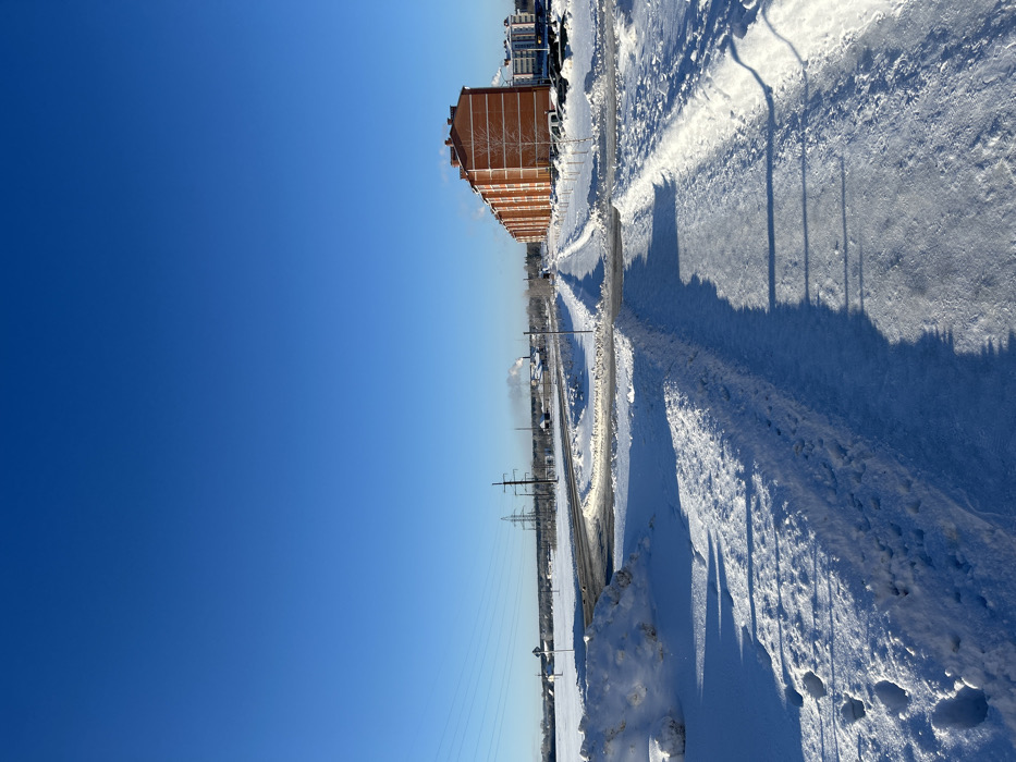 A winter scene shows a long, straight road covered in snow, flanked by snow-covered terrain. A tall, brick building sits along the road. Power lines stretch into the distance, parallel to train tracks. The sky is a clear, bright blue. Shadows of trees and poles fall across the snowy landscape.