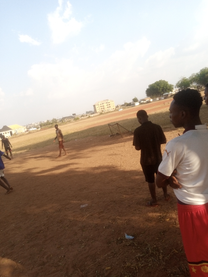 A group of young men occupy a dusty field in an urban setting