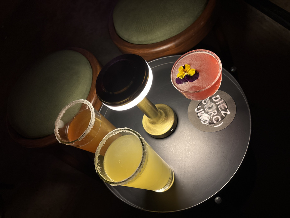 Three cocktails sit on a round, dark gray table illuminated by a modern lamp