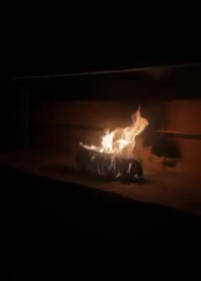 A static shot focuses on a fireplace. A log is burning inside, creating bright flames against the dark backdrop. The fireplace interior consists of light-colored bricks. The rest of the scene is obscured by darkness. A soundtrack is audible, featuring male vocals singing in Spanish.