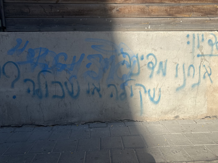 - "An outdoor, eye-level forensic photograph captures a concrete wall section exhibiting blue graffiti in Hebrew, set against a wooden paneling above and a paved sidewalk below" by FM-r6ou73, licensed under CC BY 4.0