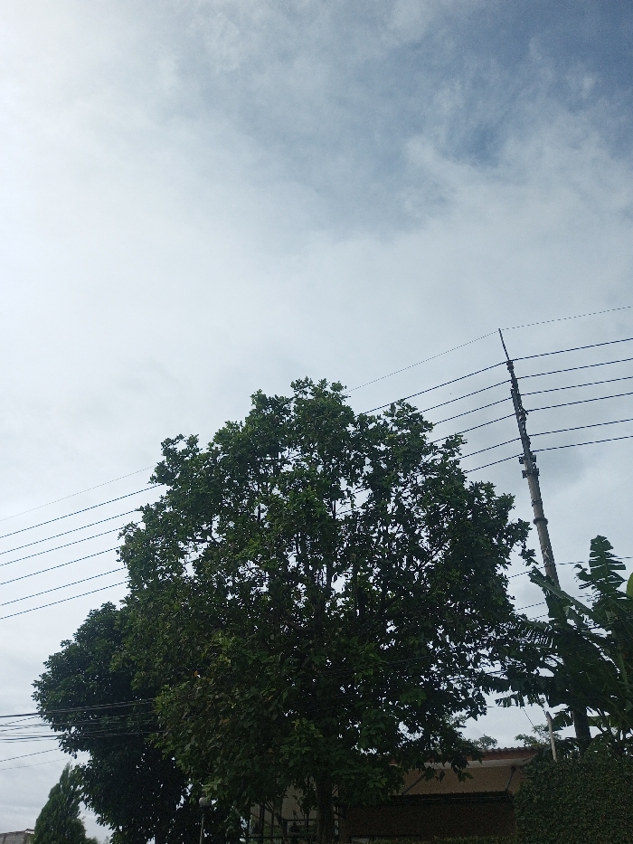 A cloudy sky fills most of the image. Beneath, a large, leafy tree dominates the frame, its branches interspersed with power lines connected to a utility pole on the right. To the right of the tree, banana leaves extend. At the bottom, a glimpse of a rooftop and shrubbery suggests a house nestled behind the trees. A smaller tree is to the left.
