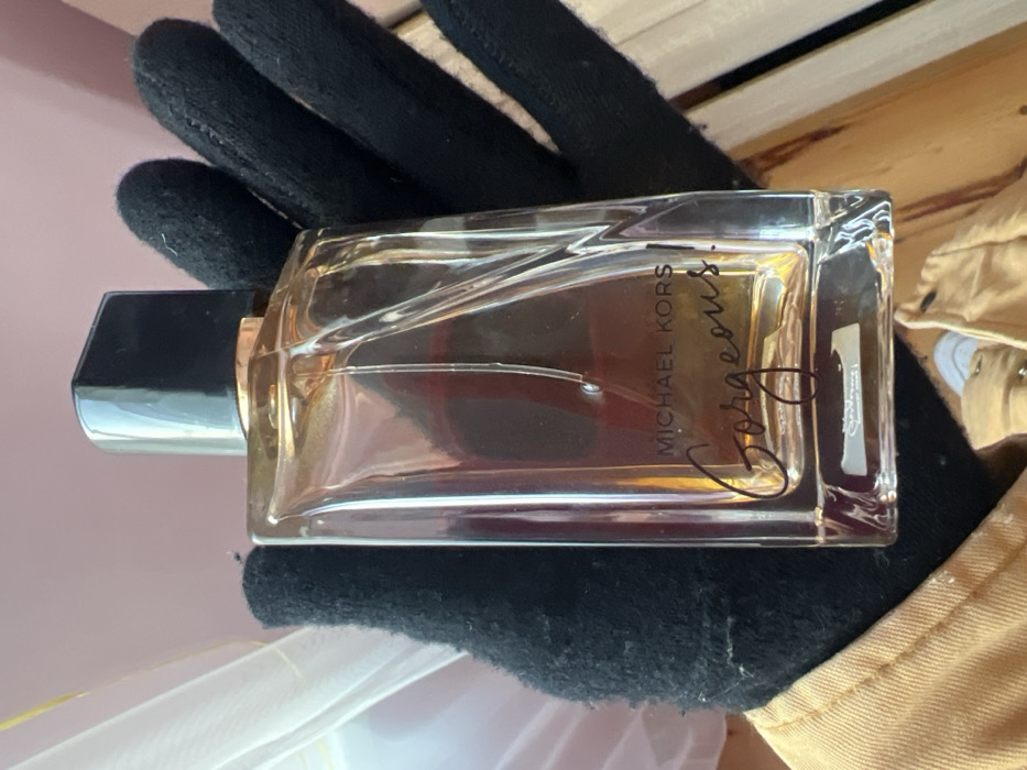 A hand in a black glove holds a bottle of Michael Kors "Gorgeous" perfume