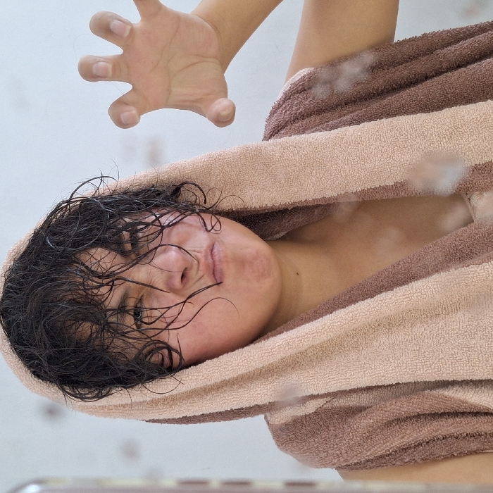 A single individual, appearing to be an adult female, is depicted in a chest-up, front-facing indoor shot. The subject's dark, wet, curly hair is disheveled, with multiple strands draped across the forehead and face. A striped towel, consisting of alternating light beige and brown bands, is wrapped over the individual's head, functioning as a hood, and draped across the shoulders. Small white fibrous debris is scattered on the towel, particularly evident on the left shoulder and chest area. The individual's face exhibits a contorted expression, characterized by a scrunched nose, tightly puckered lips forming a frown, and a furrowed brow. The left hand, positioned to the viewer's right of the head, is raised with fingers splayed and curled inward, mimicking a claw gesture. The background consists of a plain, light-colored wall, with a faint vertical edge visible on the far left. The specific location within Mariano Melgar, Peru, cannot be ascertained from the image's content.