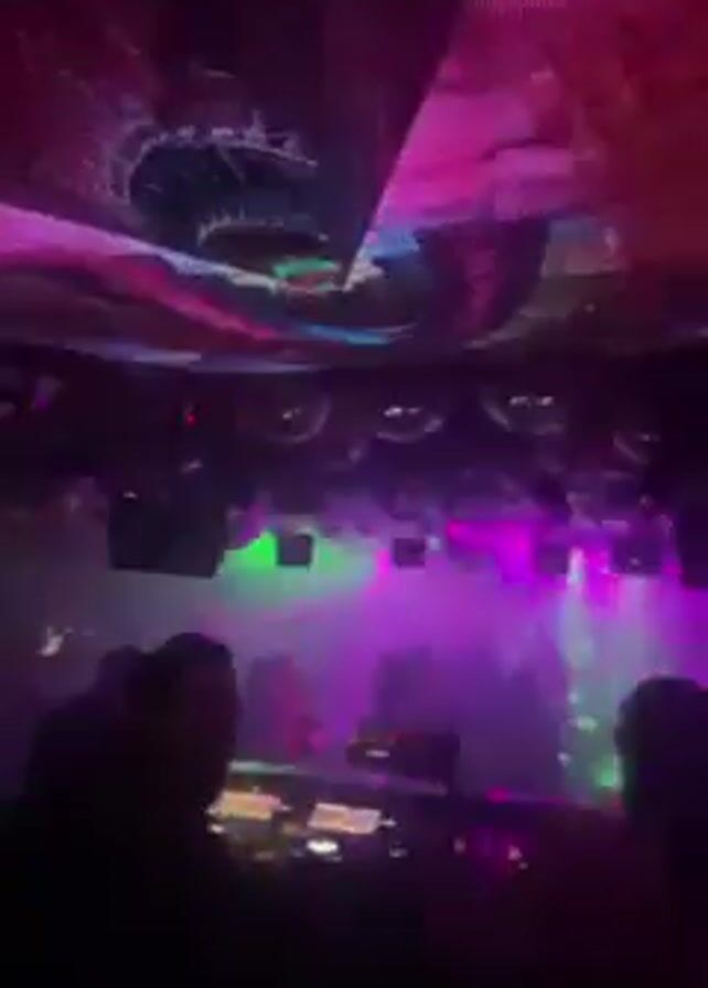 nightclub with a DJ playing music and people dancing. The ceiling is mirrored with colorful lights, and disco balls hang from the ceiling. Purple and green lasers move around the room, and there is smoke in the air. Several people are silhouetted in the foreground facing the DJ, and a small mixing board can be seen in front of the DJ.