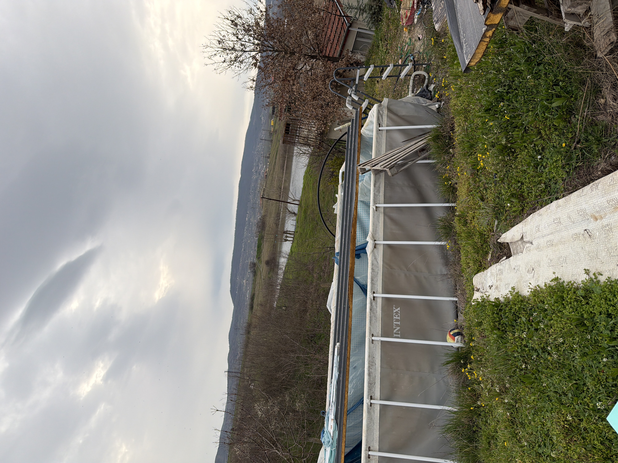 n above-ground Intex swimming pool set up in an outdoor area, likely a yard or garden, in Liaskovo, Bulgaria. The pool is gray and white, with visible metal support posts. A ladder leans against the side of the pool. The pool appears to be partially covered. A multi-colored beach ball is near the base of the pool. The surrounding environment includes green grass and other vegetation. Debris and miscellaneous objects are scattered in the area, indicating a state of disarray. In the background, a rural landscape extends toward the horizon, including a body of water (possibly a lake or river), a building with a red tile roof, hills, and bare trees. The sky is overcast.