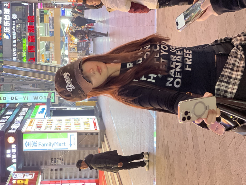 An evening street scene depicts a bustling commercial district in Yuzhong District, China, brightly illuminated by numerous neon signs and storefront lighting. The primary subject, positioned in the foreground and slightly right of center, is a young female with long, reddish-brown hair, wearing a distressed brown baseball cap featuring "Branson MISSOURI" in white text. She wears a black long-sleeved top with white, partially obscured text, and a black and white plaid shirt tied around her waist. She holds a light-colored iPhone, equipped with a triple camera array and a visible MagSafe ring, pointed towards the viewer. To her right, another individual's hands are visible, holding a second smartphone reflecting the ambient light. In the left midground, a male figure in a dark puffer jacket, dark pants, and a dark cap walks away from the camera, turning his head to look over his left shoulder. Behind him, a prominent "全家 FamilyMart" sign, featuring the FamilyMart logo and Chinese characters, is visible on a building facade. The background reveals additional multi-story buildings adorned with numerous bright Chinese character signs and LED displays. An escalator ascends into a building in the distant background, suggesting a multi-level shopping or entertainment complex. Several other pedestrians are scattered throughout the midground and background, indicating a busy urban environment. The ground is paved, reflecting some of the overhead light.