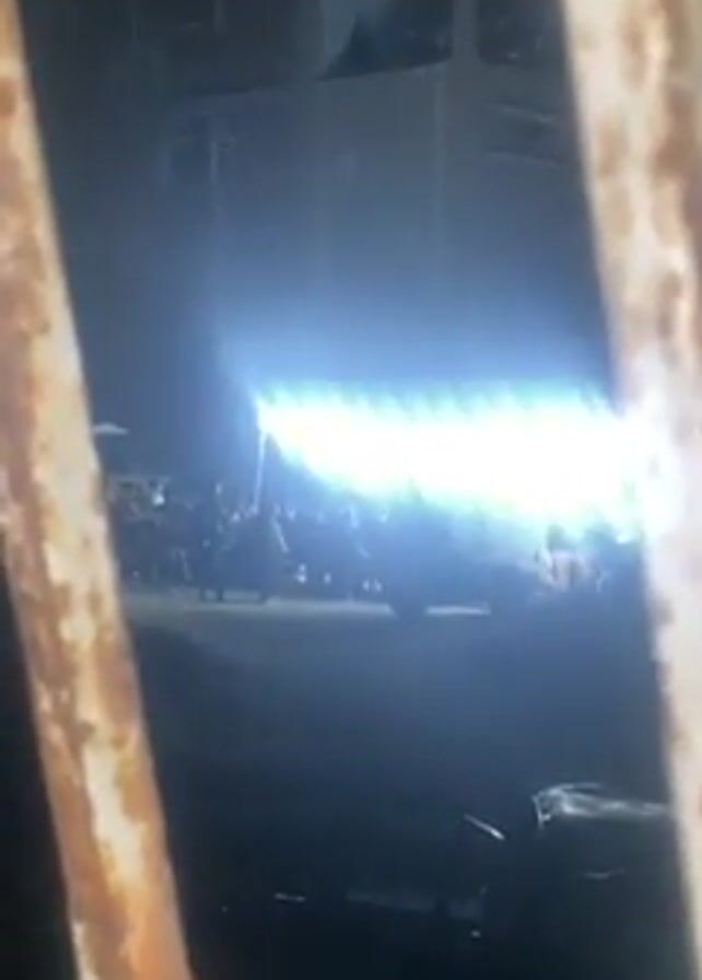 A person is recording from behind a barred window. Outside, it appears to be nighttime. A crowd of people stand in front of a vehicle with bright lights on it. There is a building in the background. The camera shakes slightly as the person records.