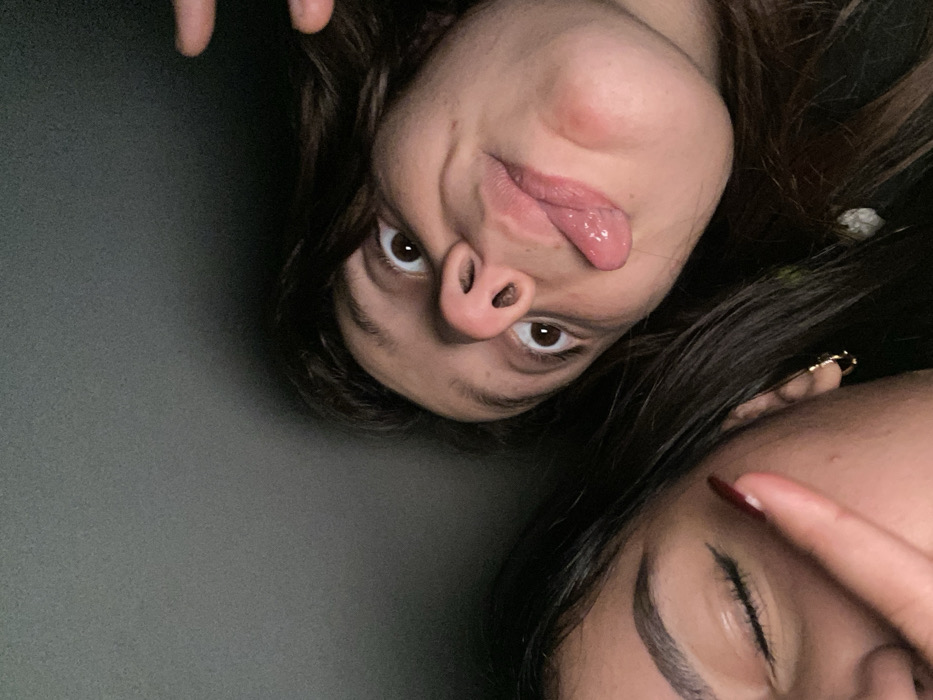 Two women pose close to the camera. The top one sticks out her tongue, with eyes open and head angled. The bottom woman's eyes are closed, with a finger pointing toward the camera, revealing a manicured nail. Both have dark hair, fair skin and are tilted downwards from the viewer's perspective. The background is a flat, gray surface.