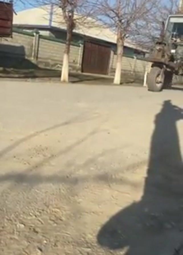 n old, light-blue tractor driving on an asphalt road. The tractor appears to be in poor condition, with missing panels and exposed engine parts. There are several bare trees along the side of the road, along with a brick building with a fence and gate. A blue car is also visible in the background. A long shadow of the person filming the video is visible, cast on the road.