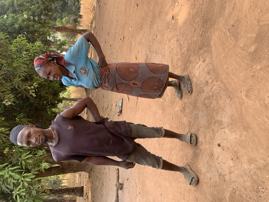 Two people stand on dirt ground. A man in a dark shirt, denim shorts, black cap, and sandals, faces the camera. An older woman with a headscarf wears a light blue shirt, patterned skirt, and sandals. They both have their hands on their hips. Trees and foliage are visible in the background. The scene appears to be outdoors on a sunny day.