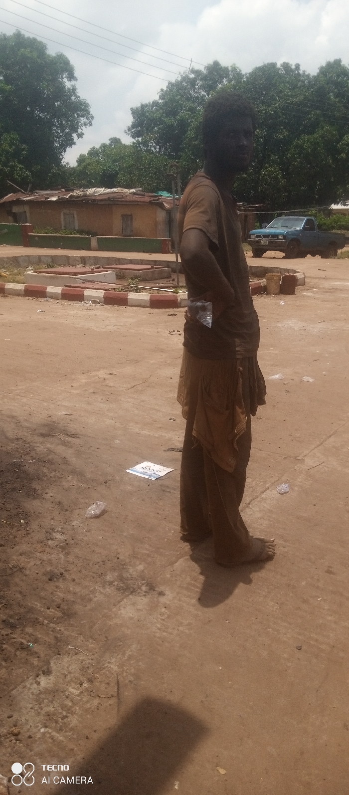 The image depicts a male individual standing barefoot on a dusty, light brown dirt ground in Shedemu, Nigeria. The subject, with dark skin and dark, short curly hair, wears a dark brown t-shirt and loose, brown trousers or a wrap garment extending to the ankles. A clear plastic item is tucked into the left side of their waistband. The individual stands in a slight three-quarter profile, facing generally right, with their head turned towards the camera. In the mid-ground, a concrete traffic island or barrier with red and white striped curbing is visible. Behind this, several low-rise buildings with brown walls and disheveled roofs are present. Lush green trees dominate the background, and overhead power lines traverse the cloudy sky. A light blue pickup truck is parked in the far-right mid-ground. Debris, including plastic bags and a white cardboard item with blue text ("O'coco"), litters the ground. A strong shadow of the standing individual is cast on the ground to their left.