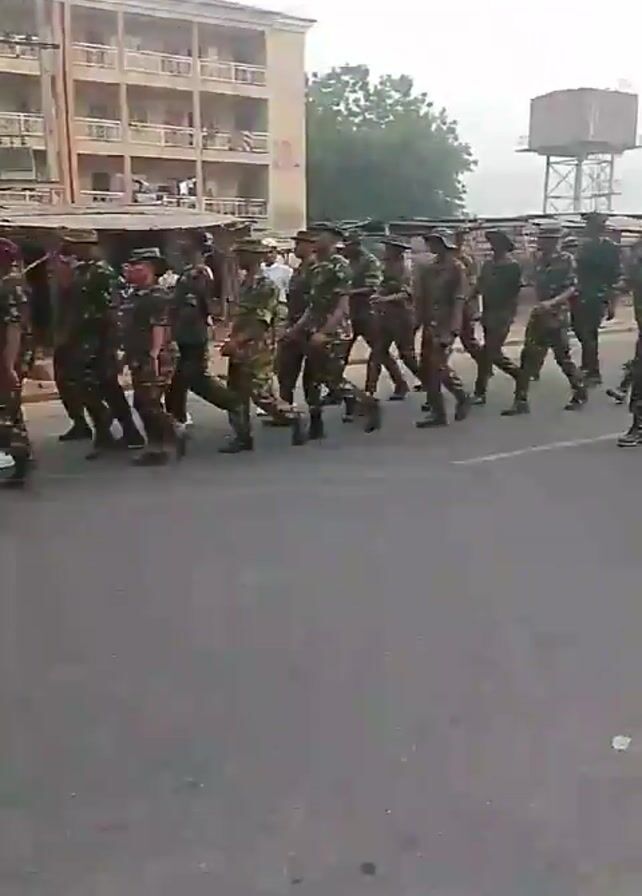 large group of people marching down a paved road. Most of them are wearing military camouflage uniforms, while some others are wearing civilian clothes. Some of the people in uniform are carrying rifles. There is a black flag being carried as well. The group is moving at a steady pace, and there are sounds of shouting or chanting. The surrounding environment consists of buildings, trees, and a water tower in the background.