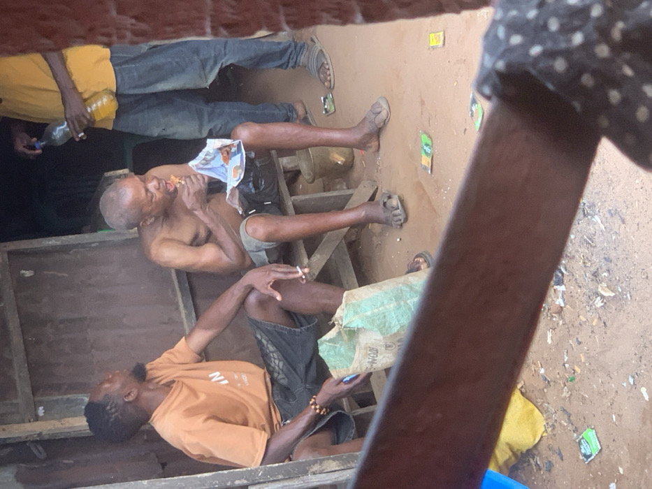 The image depicts three adult males in an informal outdoor setting within the city of Onitsha, Nigeria. Two individuals are seated on a wooden bench against a backdrop of a corrugated metal and wooden structure, while a third stands to their right. On the left, a man with dark skin and dreadlocks wears an orange t-shirt and dark shorts. He is seated, leaning back with his head tilted upwards and to the left, holding a lit cigarette between the fingers of his right hand. A beaded bracelet adorns his left wrist. Next to him on the ground is a large, light green woven bag with partial text "UN-WOO". In the center, a man with dark skin, a shaved head, and bare torso is seated on the same bench. He wears dark shorts and flip-flops, actively eating a food item wrapped in a patterned paper. A small, dark bucket is visible beneath his seat. To the right, partially visible, a man with dark skin stands wearing a yellow t-shirt and blue jeans, with slide sandals on his feet. He holds a clear plastic bottle containing a yellowish liquid, appearing to pour or handle it. The ground is exposed dirt, littered with various small green, yellow, and red packets, along with other debris and white granules. A dark wooden beam or railing crosses the lower foreground, partially obscuring the lower halves of the seated individuals and the ground.