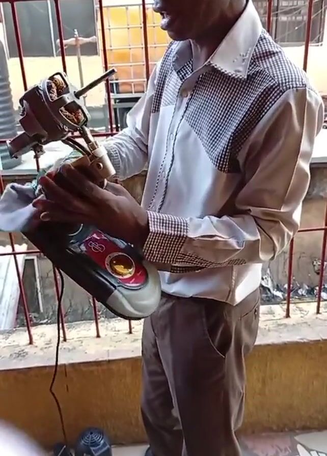 A man is holding a disassembled table fan outside on a patio. He is wearing a white and patterned long-sleeve shirt and brown pants. He uses a rag to wipe the motor of the fan. The fan's base is black, gray, and red. A metal railing is in the background along with building windows and an air conditioner unit. The floor is bare and there is part of another fan on the ground.