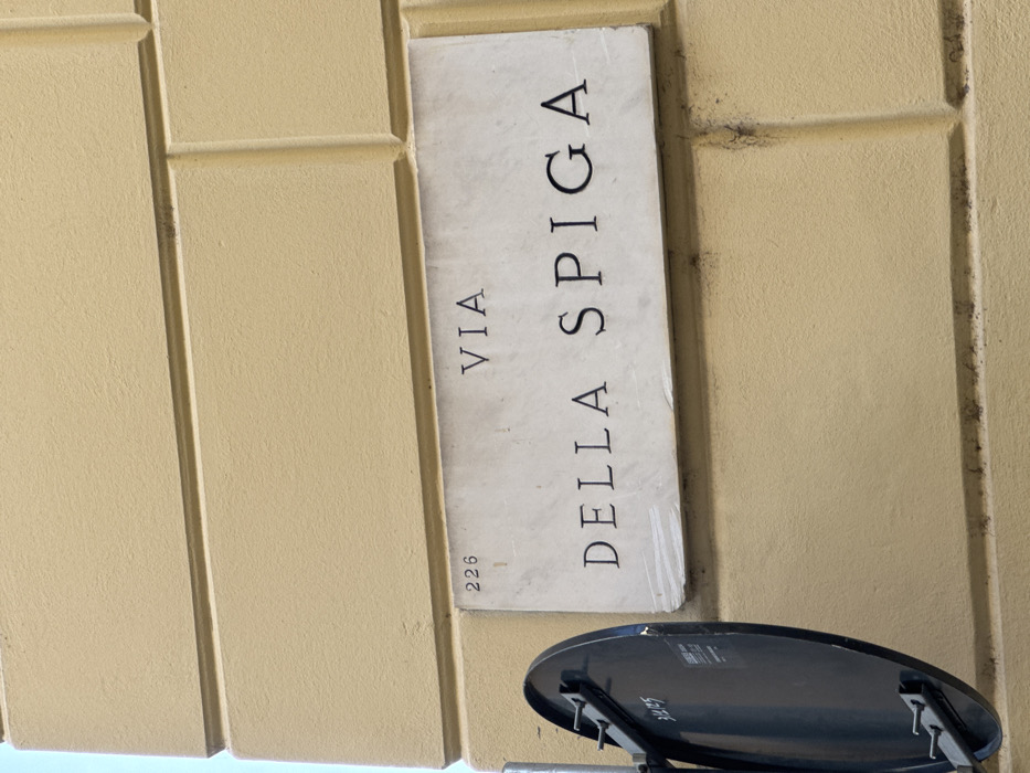 The image displays a close-up, angled view of a street sign mounted on a building facade. The street sign is a rectangular, light-colored stone or marble slab with the inscription "VIA" on the upper line and "DELLA SPIGA" on the lower line, rendered in black, sans-serif capital letters. A numeral "226" is present in the upper left corner of the sign. The sign exhibits horizontal scratch marks on its lower left surface and some grime accumulation, particularly along the bottom edge. The sign is affixed to a pale yellow, textured wall featuring horizontal and vertical grooves that simulate large, rectangular block construction. The wall shows minor discoloration and dirt in the grooves. To the immediate left of the street sign, a dark, circular, flat object is visible, mounted on a vertical pole (partially obscured) by two dark metal brackets and bolts. White markings, including "3.12.5" and a partial label, are discernible on the surface of this circular object. The scene is brightly lit, suggesting daylight conditions. No people or specific actions are depicted. The location is Via della Spiga in Milan, Italy.