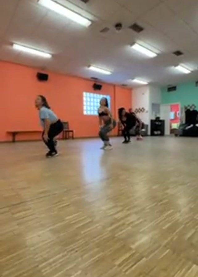 The scene is a dance studio with a wooden floor, white ceiling, and fluorescent lighting