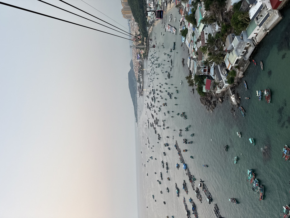 An aerial view from a cable car overlooks An Thới Bay in Phú Quốc, Vietnam, under a hazy, pale grey sky