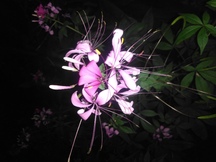 - "This is a nighttime, eye-level photograph captured in Parroquia San Francisco, Venezuela, depicting a cluster of vibrant purple-pink Cleome hassleriana (Spider Flowers) against a dark, out-of-focus background" by FM-f4dh13, licensed under CC BY 4.0