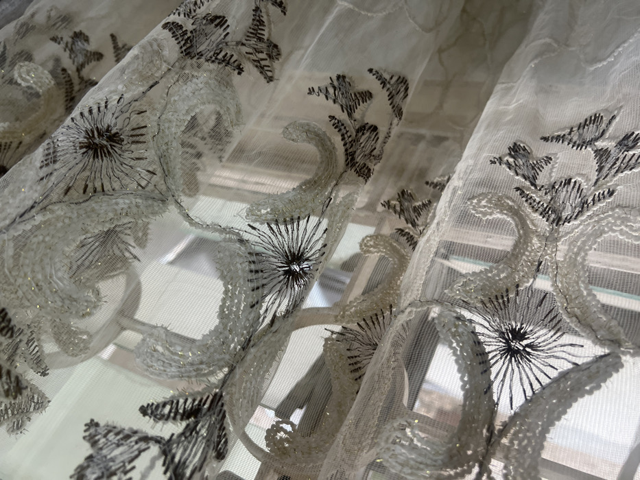 An up-close view of sheer, decorative curtains. The fabric is adorned with intricate embroidery. Floral patterns with thread radiating from the center contrast against the sheer material. A wavy, textured embellishment borders the floral and foliage design. Light streams through the fabric, illuminating the delicate details of the stitching. The backdrop reveals a window and hints of an outdoor view, subtly blurred by the curtain.