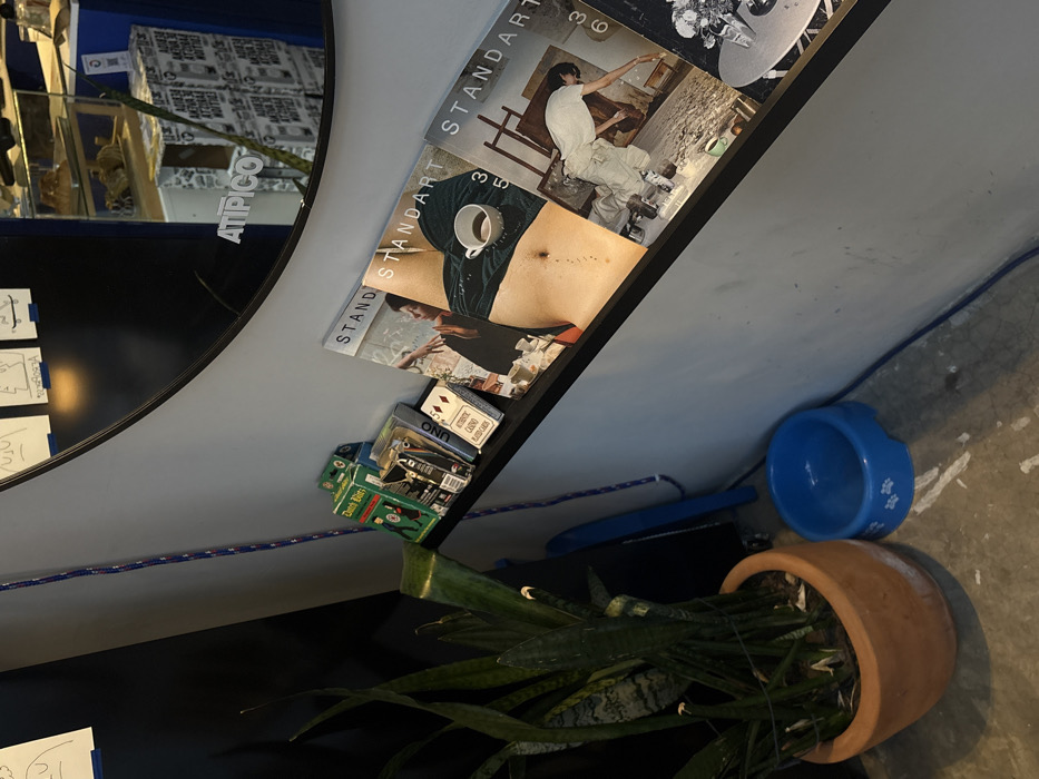 The image depicts an interior corner of a commercial establishment identified as Atipico, located in Heroica Puebla de Zaragoza, Mexico. On a light gray concrete floor, a large potted Sansevieria plant in a terracotta pot stands to the left. Adjacent to the plant is a blue plastic pet bowl featuring white paw print designs. A blue and white braided cord extends along the floor near the base of a light gray wall. Above the pet bowl, a black wall-mounted shelf displays a collection of items, including several boxed card games like "Dutch Blitz," "UNO," and "AUTHENTIC CASINO PLASTIC CARDS." To the right, multiple copies of "STANDART" magazine are arranged, with visible covers for issues 35 and 36. Issue 35 features a person's midsection with a coffee cup, and issue 36 shows a person near an art easel. The upper right portion of the scene is dominated by a large, circular, black-framed mirror that reflects an interior space, including a display case containing baked goods or pastries and a patterned wall fixture. The word "ATIPICO" is visible in white lettering on the mirror's surface. In the upper left, several pieces of white paper with black drawings are taped to a dark wall section. No individuals are directly performing actions in the immediate foreground.