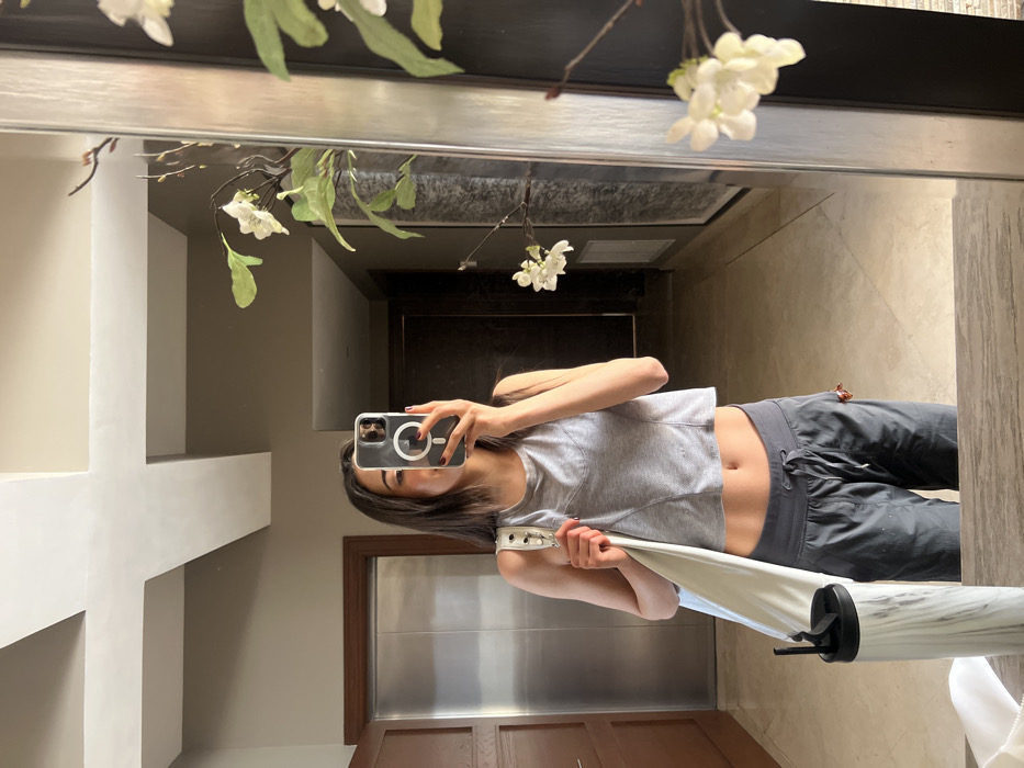 A young adult female is depicted in a mirror selfie taken within a modern interior space, likely a hallway or foyer of an upscale residential or commercial building in Mexico City, Mexico. She is standing centered, holding a smartphone with a dark case and a visible MagSafe ring in her right hand to capture her reflection. Her left hand holds the strap of a white tote bag that hangs over her shoulder. She wears a grey sleeveless crop top, exposing her navel, and dark grey athletic pants with a drawstring. On the wooden surface directly in front of the mirror, a white and grey marbled insulated water bottle with a black lid and straw is visible. The reflection reveals a light-colored ceiling with a distinctive cross-shaped architectural recess, light-colored tiled flooring, and a section of brown wooden wall paneling adjacent to a silver-toned elevator door on the left. To the right of the mirror, a decorative arrangement of branches with white flowers and green leaves is partially visible, reflecting against a darker wall that extends down a hallway.