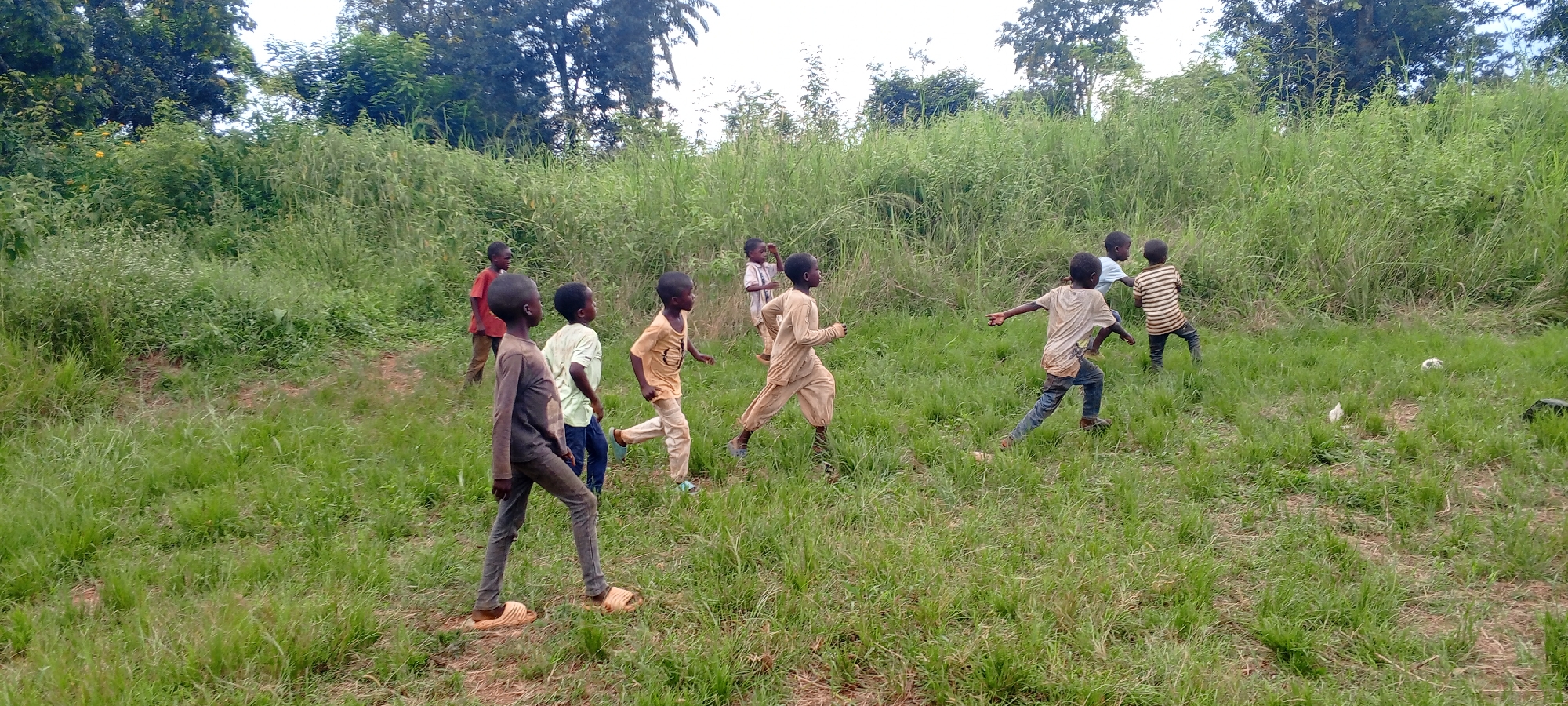 In a field of tall green grass in Ngalula, Democratic Republic of the Congo, eight young boys are playing