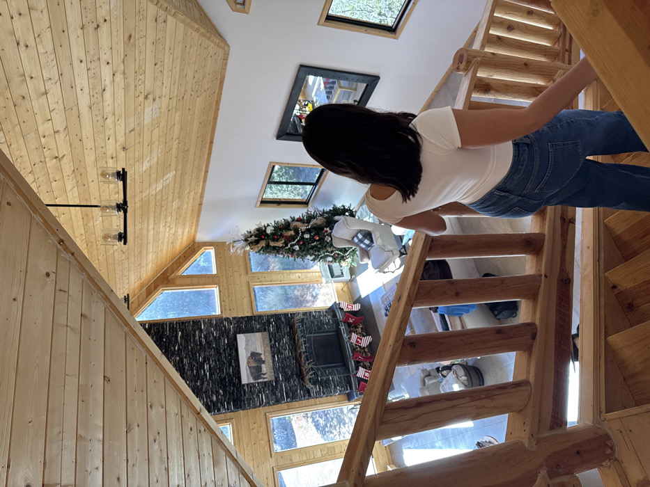 A woman descends wooden stairs in a wood-paneled home. The living room below features a stone fireplace with an animal painting and multiple windows. A Christmas tree stands decorated, and American flag stockings are displayed above the fireplace. Natural light fills the space, entering through the numerous windows and skylights.