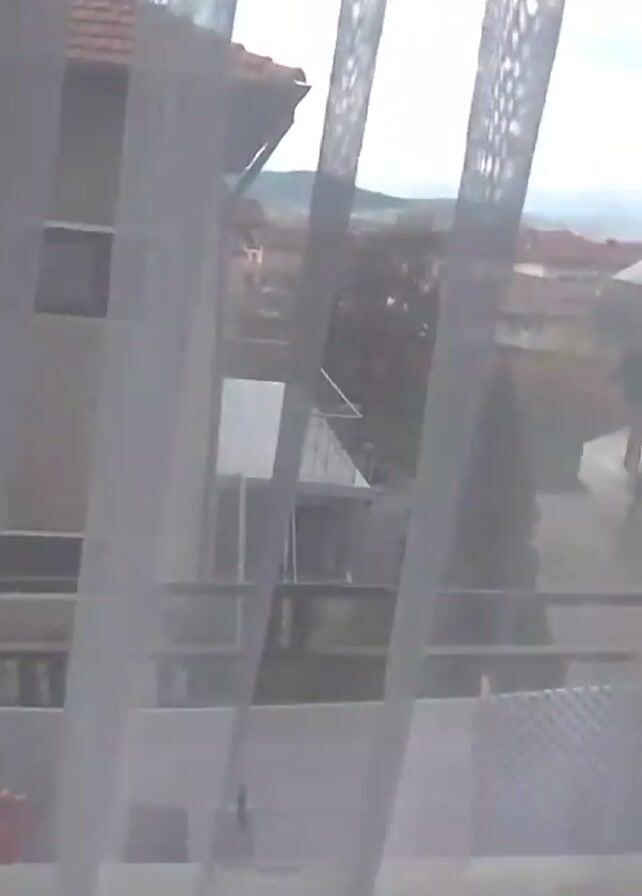 view from a window. Initially, the view is obscured by white, sheer curtains, but they are pulled aside to reveal a daytime scene of a town and distant mountains under a blue sky with fluffy white clouds. A hand appears in the frame, fingers spread as if holding the curtains open. The view is slightly distorted by the texture of the sheer curtains. The buildings in the town have red tile roofs. The camera is static.