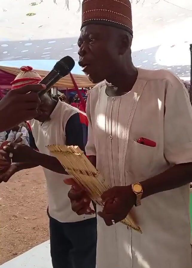 An older man in a tan shirt and brown hat is speaking into a microphone. He is holding a wooden object in his hands. Another man wearing a hat is holding the microphone. They are both standing under a white tent-like structure. Other people are in the background.