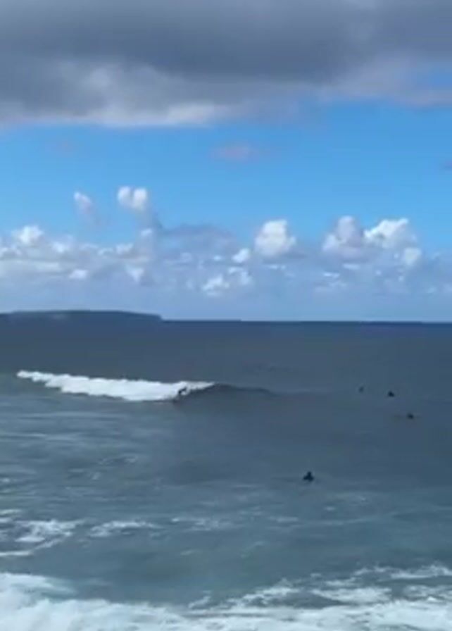 surfer riding a wave in the ocean. The surfer is wearing a black wetsuit and is standing on a surfboard. The wave is breaking in front of the surfer and they are riding the wave towards the shore. There are other surfers in the water waiting for waves. The sky is blue with white and gray clouds, and there is a landmass visible in the distance. The ocean is a dark blue color, with white caps on the waves.