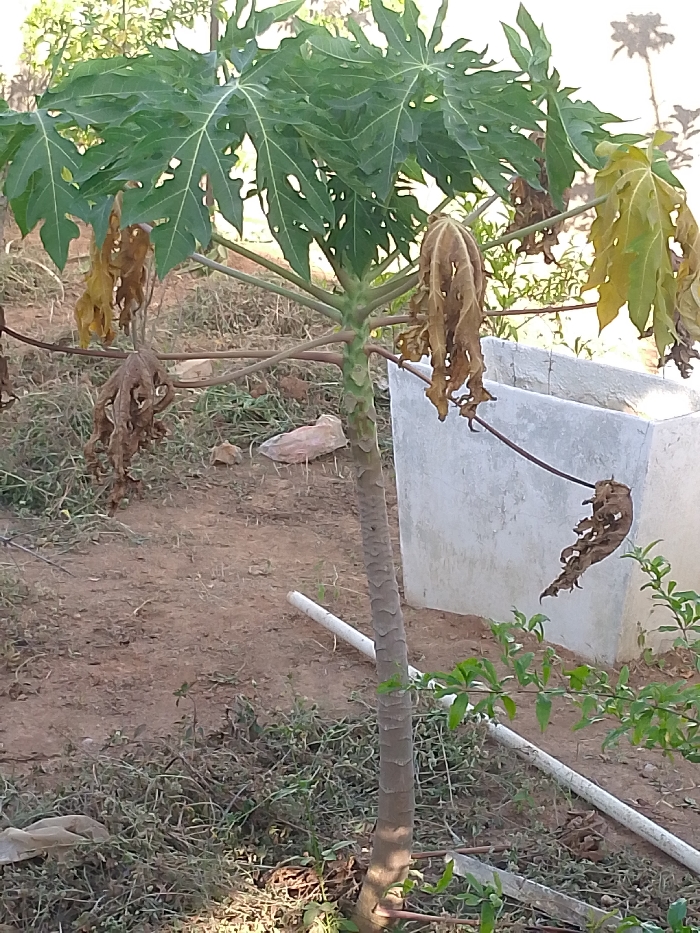 This image captures an outdoor scene in Kwang, Nigeria, centered on a papaya tree (Carica papaya). The tree features a slender, light brown trunk with a canopy of green, palmate leaves at its upper section, some showing minor tears. Numerous lower leaves are brown, withered, and shriveled, hanging downwards. The ground is composed of reddish-brown soil, partially covered with dry grass and scattered small rocks. To the right of the tree, a light grey, open-topped, rectangular concrete structure is visible. Two white PVC pipes lie horizontally on the ground in the foreground, one partially obscured by small green plants. A light-colored piece of discarded material rests on the ground in the left mid-ground. The area is illuminated by natural daylight. No people or animals are present.