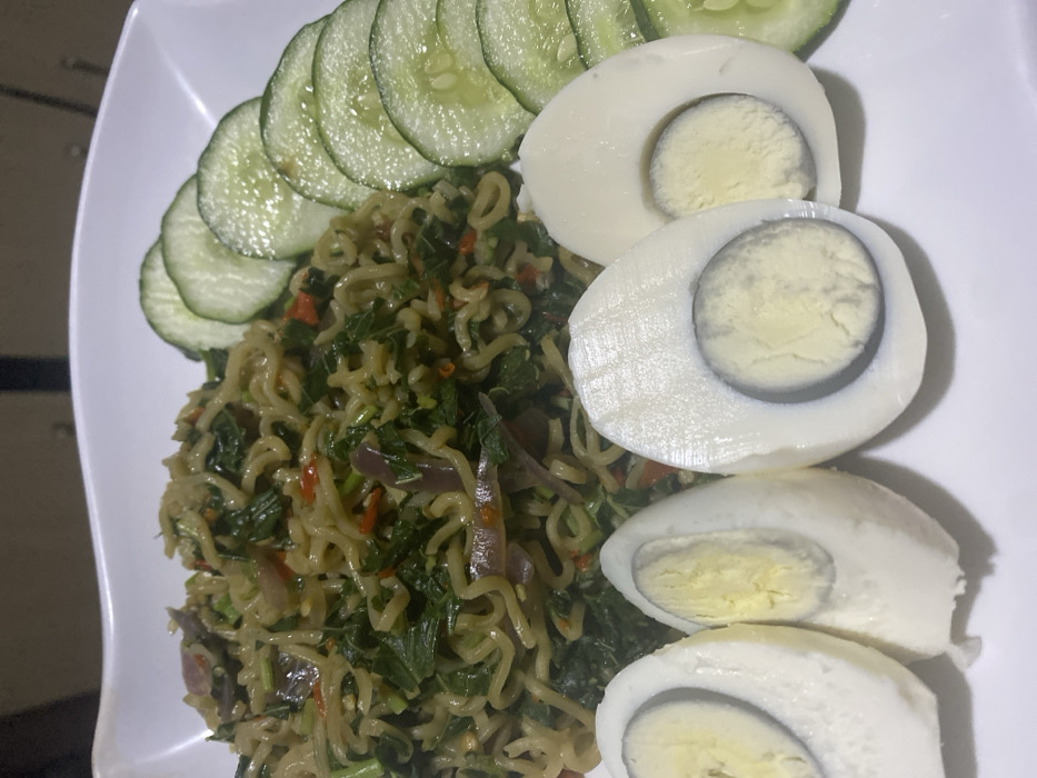 A white plate displays a culinary creation. Sliced cucumbers form a vibrant green arc on the upper left. Next to the cucumbers is a tangle of noodles mixed with leafy greens, red peppers, and onions. Along the right edge of the plate, boiled eggs are cut in half. The egg whites are smooth and reflect light, while the yolks are a pale yellow.
