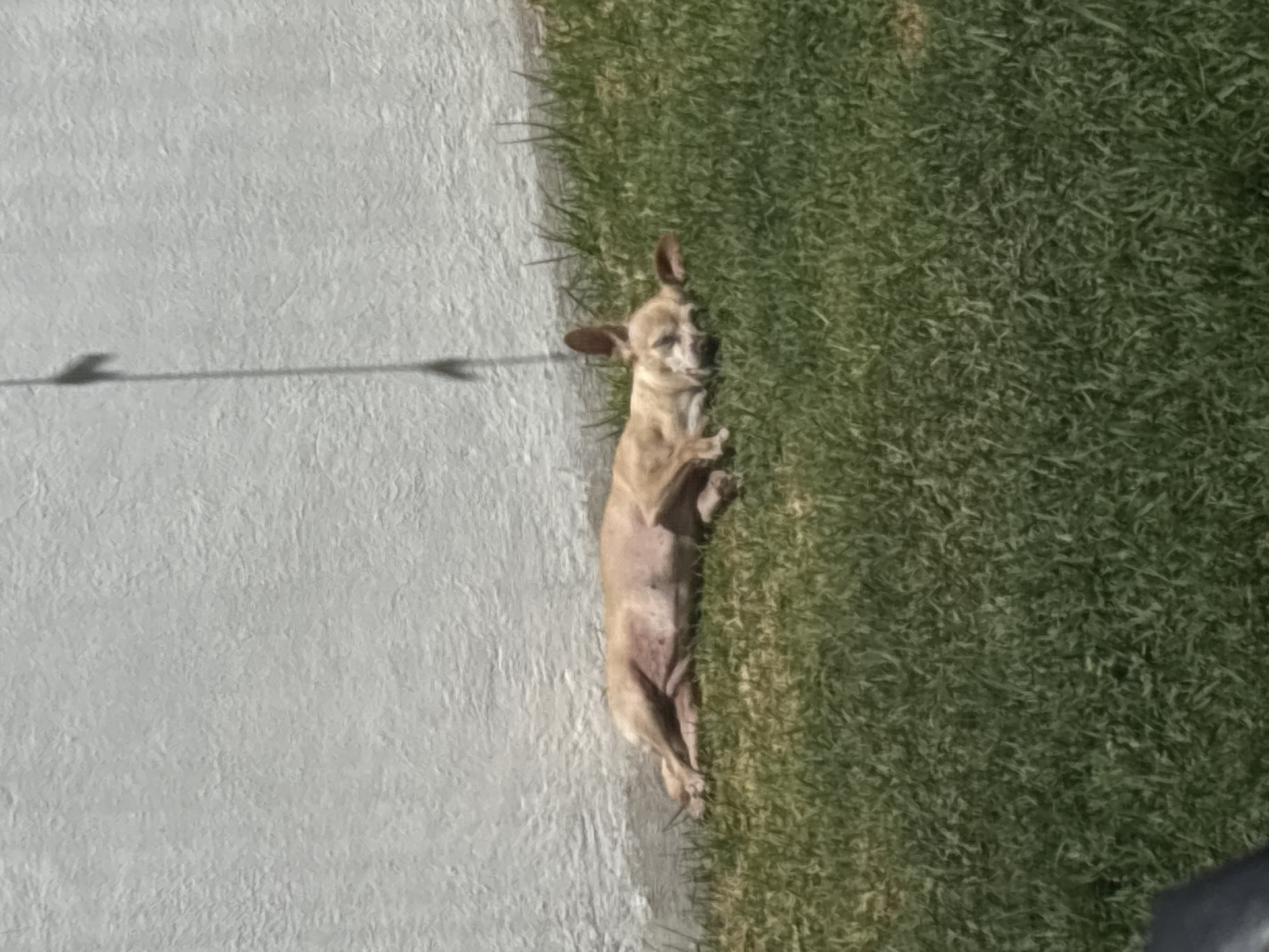 A tan chihuahua is lying on its back on a patch of green grass adjacent to a gray concrete surface. A thin, dark shadow crosses the concrete surface. The location is San Juan Cuautlancingo, Mexico.