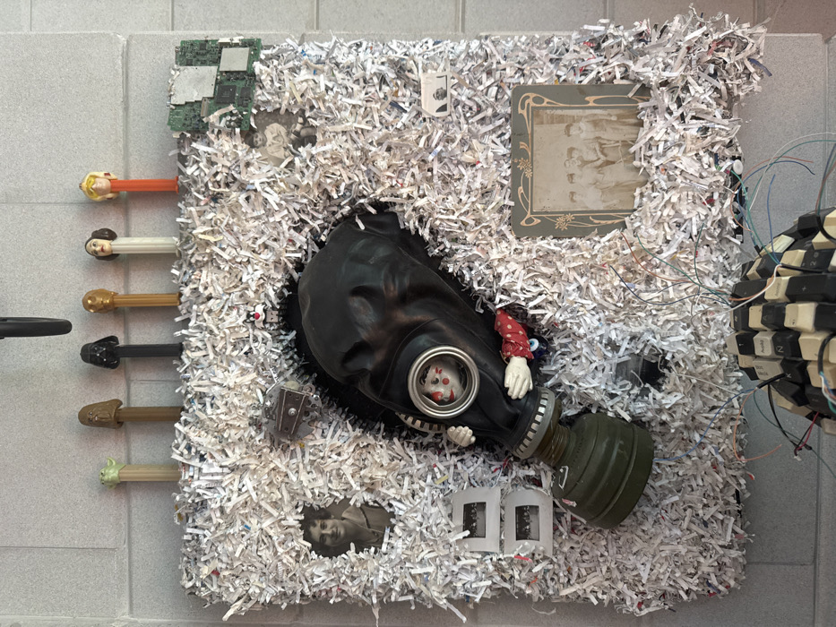 The artwork features a square frame filled with shredded paper. A black gas mask sits prominently in the center, revealing a doll with a clown face and a hand wearing a red polka-dotted sleeve. Surrounding the mask are various items including vintage photos, slides, a circuit board, candy dispensers, and an object constructed from black and white computer keys with exposed wires. A framed photograph is placed towards the upper right corner. These disparate elements are assembled within the confines of the square frame.