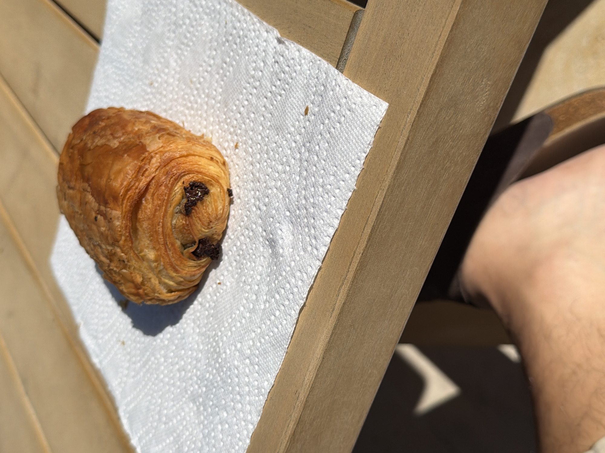 A single, golden-brown pain au chocolat with a flaky, layered texture rests on a white, dimpled paper napkin. The napkin is positioned on a light-colored, horizontally slatted wooden surface, exhibiting visible grain patterns. Direct, bright sunlight illuminates the scene, casting a distinct shadow of the pastry onto the napkin and wood. Below the wooden surface, in the lower right quadrant, a portion of a light-skinned, hairy human foot wearing a dark sandal or shoe is partially visible. The scene is outdoors in Mougins, France.