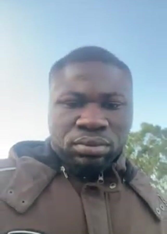 A man with dark skin and short, neatly trimmed hair looks directly into the camera. He is wearing a brown jacket and standing outdoors under a bright, overcast sky. There are trees visible in the background. The camera is held at a low angle, looking up at the man. He appears to be calm and composed.