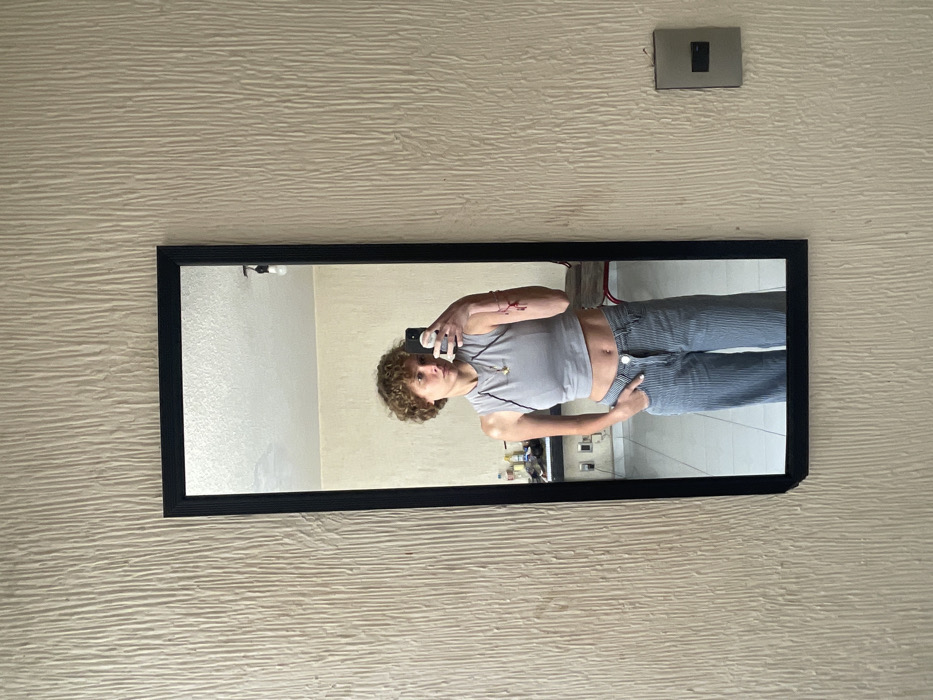 A young, fair-skinned individual with short, curly brown hair is depicted in a mirror selfie taken indoors