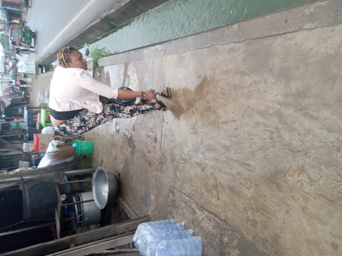 A woman with light skin and blonde braided hair is depicted sweeping a wet concrete surface with a short broom-like object. She wears a light-colored long-sleeved shirt, black and white patterned leggings, a black waist belt, and dark sandals. Her body is bent forward at the waist as she performs the action. To her left, a stack of clear plastic bags containing smaller water sachets or bottles is visible on the ground. Adjacent to this are a large silver metal bowl, two large silver metal pots on a wooden table, a green plastic bucket, and a bundle of brooms leaning against a wooden structure. The background on the left features various makeshift market stalls or shops constructed from wood, corrugated iron, and tarpaulins, with assorted goods and containers. To her right, a concrete drainage ditch filled with greenish water runs parallel to the sidewalk. Beyond the ditch is an asphalt road, where a green and red motorized tricycle (keke Napep) and other blurred figures are visible in the distance. A "POS" sign is also discernible along the roadside. The ground surface, including the concrete where the woman is sweeping and sections of the road, appears wet. The scene is an outdoor urban environment, consistent with a street or market area in the city of Aba, Abia State, Nigeria, during daylight hours, possibly after rain or a cleaning effort.
