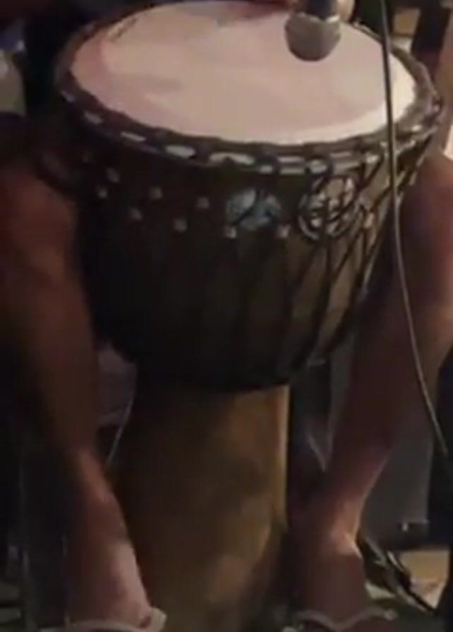 person sitting and playing a djembe drum. The person is wearing flip-flops and dark pants. The drum is brown and black with a white head. A microphone is positioned above the drum, likely to amplify the sound. The drum is supported by a wooden stand. The background is dark and indistinct, suggesting an indoor setting. The person strikes the drum head with their hands, creating rhythmic drumming.
