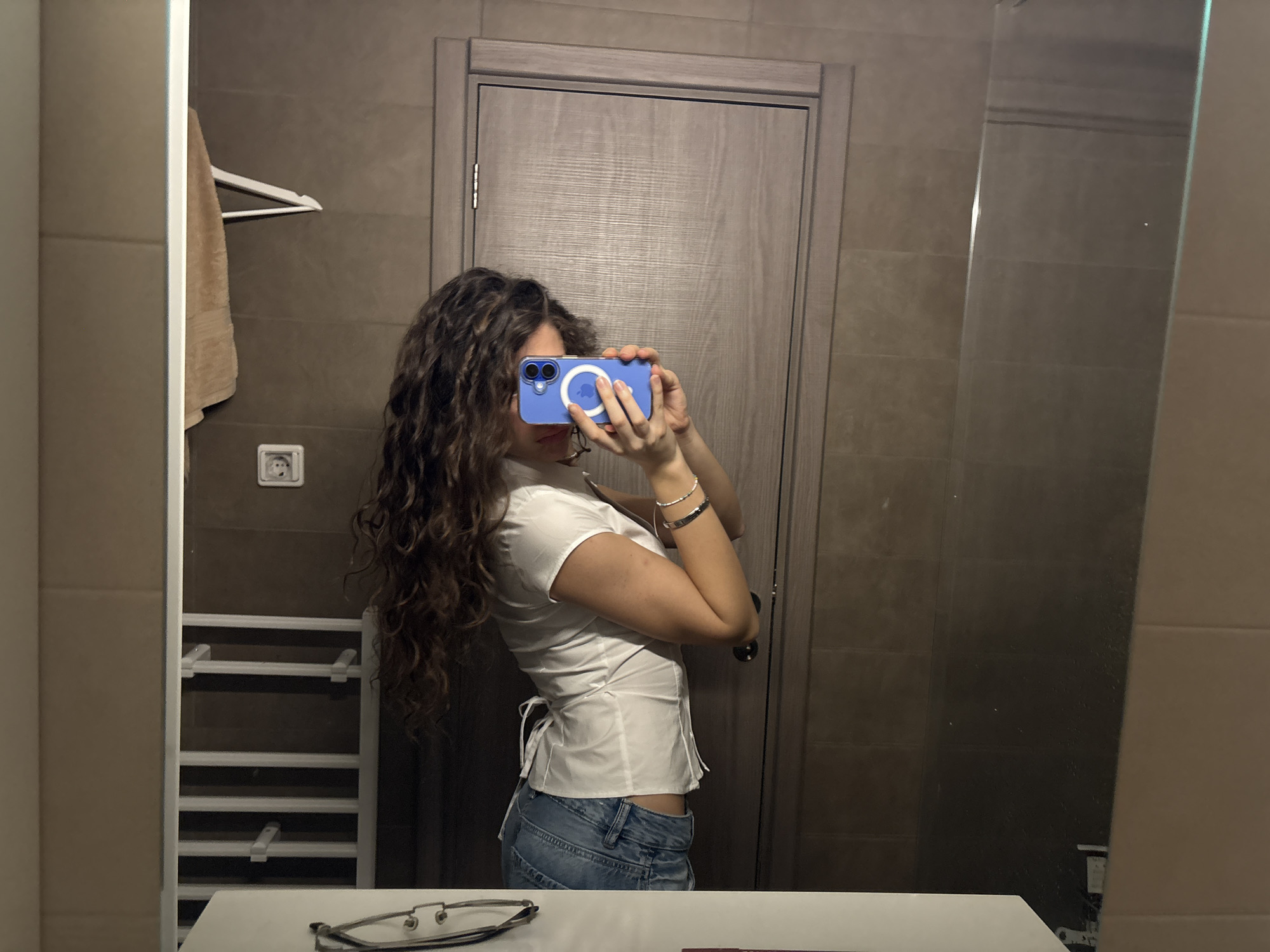 An individual is captured in a mirror selfie within what appears to be a bathroom or dressing area in Sofia, Bulgaria. The person, with long, dark, curly hair, is wearing a white, short-sleeved wrap-style top and light blue denim jeans. Their face is obscured by a blue smartphone, held horizontally in both hands, featuring a prominent white MagSafe ring on its case. Silver bracelets are visible on the individual's left wrist. The reflected environment features walls tiled in a neutral brown or taupe color. A light-colored wooden door with a visible grain pattern is present in the background, framed by a matching door frame. To the left of the individual, a white clothes hanger suspends a light tan towel, with a white European-style power outlet located below it. A white, multi-bar wall-mounted towel warmer or rack is partially visible in the lower left reflection. The foreground shows a white countertop surface, on which a pair of silver-rimmed eyeglasses rest. The scene is illuminated by interior artificial lighting.