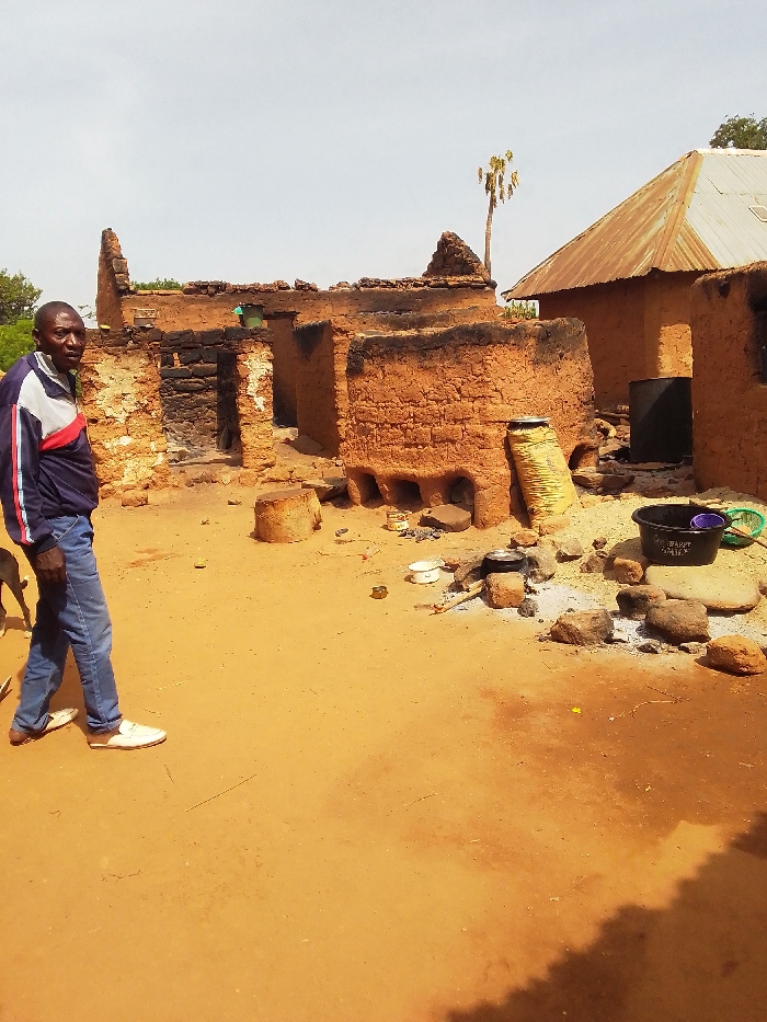 scene in Kwal, Nigeria, at the coordinates 9.803 latitude, 8.646 longitude. The scene is an open-air courtyard with a partially destroyed mud brick building on the left side of the image. The building is partially destroyed and has a black, charred exterior, likely caused by a fire. There is a tall, dry palm tree in the background. In the middle of the courtyard is a large, round, mud brick structure, possibly a kiln or an oven, also with a black, charred exterior. The structure has six open vents on its side, suggesting it was used for heating or cooking. There are multiple cooking pots and other utensils scattered around the courtyard, as well as some rocks. A man wearing a blue and red jacket, blue jeans, and white shoes stands in the courtyard, facing the camera. There is a dog in the foreground, partly visible. The scene has an overall dusty, dry, and arid environment. The image shows evidence of past use, particularly the charring and the remains of cooking materials, suggesting that the structure was recently used. The overall tone of the image is one of abandonment or neglect.