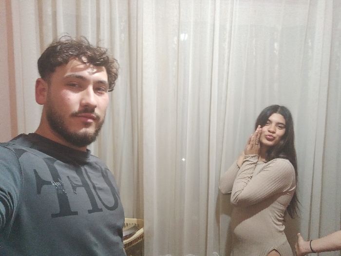 This image displays two individuals, an adult male and an adult female, indoors against a backdrop of light-colored, floor-to-ceiling curtains. The male, positioned on the left and partially cropped, has dark curly hair and a beard, and wears a dark grey long-sleeved shirt with discernible dark text. He looks directly forward at the camera. The female, positioned on the right, has long dark hair and wears a light-colored, ribbed long-sleeved dress with a high side slit. She faces the camera with her hands pressed together below her chin and her lips puckered. A ring is visible on her left ring finger. A partial hand, belonging to an unseen third individual, is visible in the lower right corner. A wicker object is partially visible in the lower left background. The image provides no specific visual cues to determine its location within the city of Roman, Bulgaria.